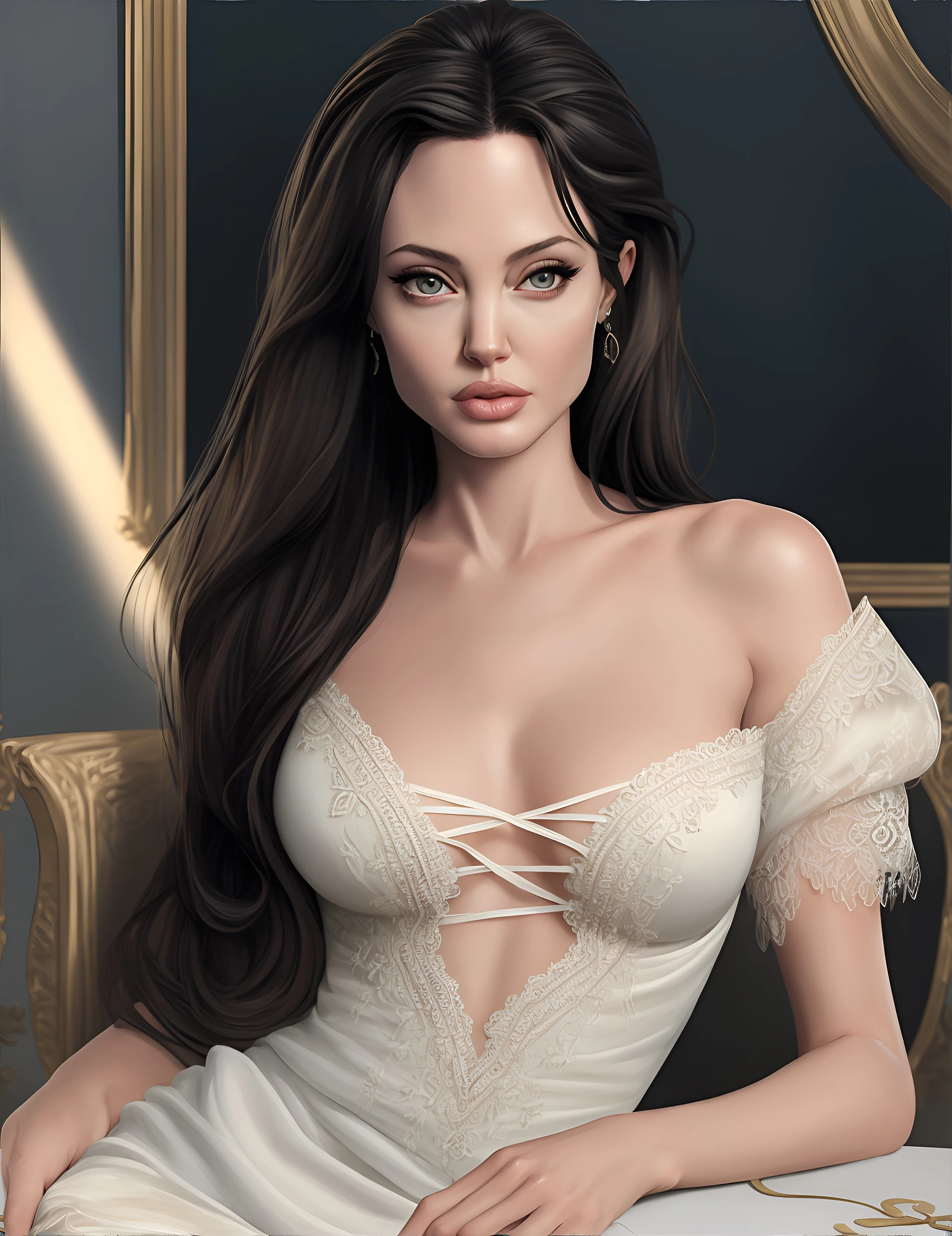 A strikingly realistic portrayal of young Angelina Jolie captured in a captivating pose, exuding confidence and allure. The image, whether a photograph or a painting, showcases Angelina Jolie wearing exquisite lingerine and highlighting her prominent big bobs. The attention to detail is remarkable, capturing the intricate lace patterns and the subtle play of light and shadow on her flawless skin. The image radiates a sense of intimacy and sensuality, enticing viewers with its provocatie composition. The high-quality execution of this image brilliantly showcases the beauty and charisma of Angelina Jolie with an artistic finesse that truly mesmerizes.