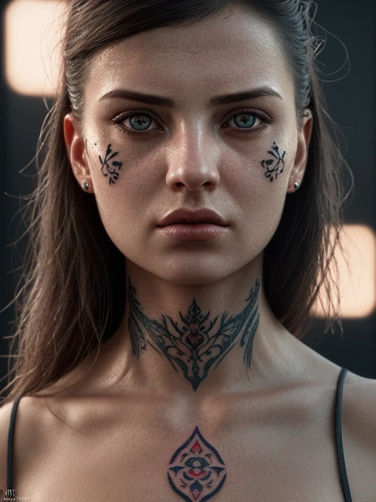 close-up portrait female french, very small facial tattoo, deep eyes, luxury, bright colors, dark illumination, very detailed artwork, trending on artstation, symmetrical, cinematic, hyper realism, high definition, octane render, 8k