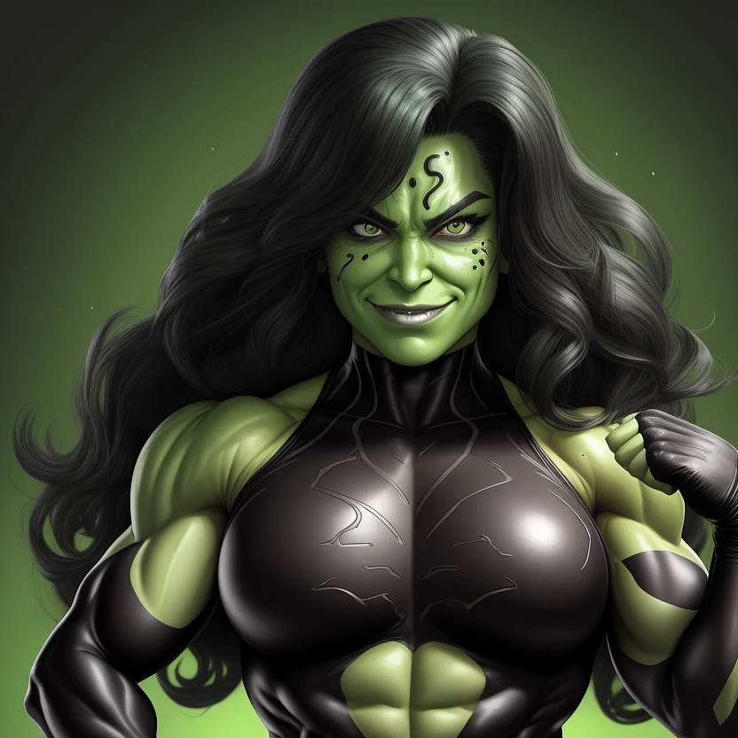 1 bodybuilder woman wearing symbiote, She-Hulk, young beautiful face, soft face, full body visible, soft smile, smooth face, happy face expression,