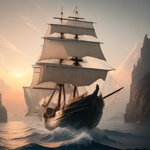Photo of a ultra realistic sailing ship, dramatic light, pale sunrise, cinematic lighting, battered, low angle, trending on artstation, 4k, hyper realistic, focused, extreme details, unreal engine 5, cinematic, masterpiece, art by studio ghibli, intricate artwork by john william turner