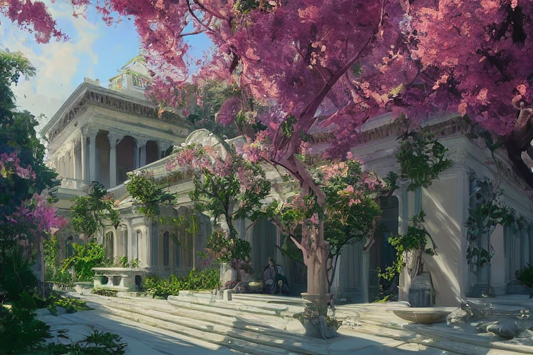 green weed grow house, rococo style, greek architecture, pink marble building, marijuana trees, sakura season weed leaves dynamic lighting, landscape, artwork by jeremy lipkin and giuseppe dangelico pino and michael garmash and rob rey and greg manchess and huang guangjian and makoto shinkai, pixiv, 1 0 0 mm