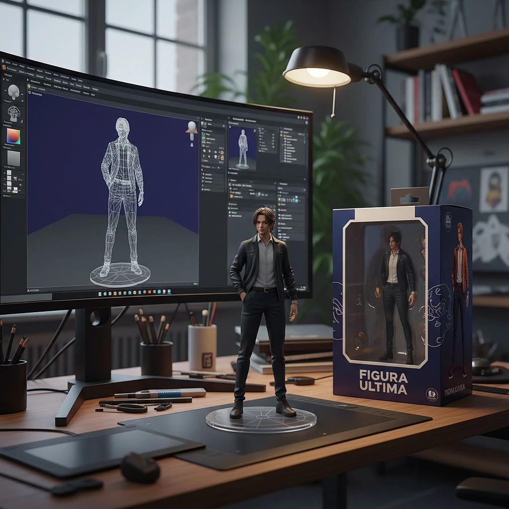 Transforming the photographed person into a realistic 3D figurine in front of a computer desk. The computer screen displays a 3D design drawing of the figurine's software interface. The figurine has a transparent base, and next to it is its matching packaging box, allowing the figurine to be seen. The overall scene is in a realistic style, with the character presented in an ultra-realistic manner. The image quality reaches 4K high definition, the lighting effects are bright and layered, and the colors are saturated and vibrant, showcasing the exquisite imaging effect of high-end photography. Visual Tone: The scene is rich in color and visually impactful. The camera should be able to display different grand backgrounds, with detailed and lively elements in the background, creating an immersive experience.