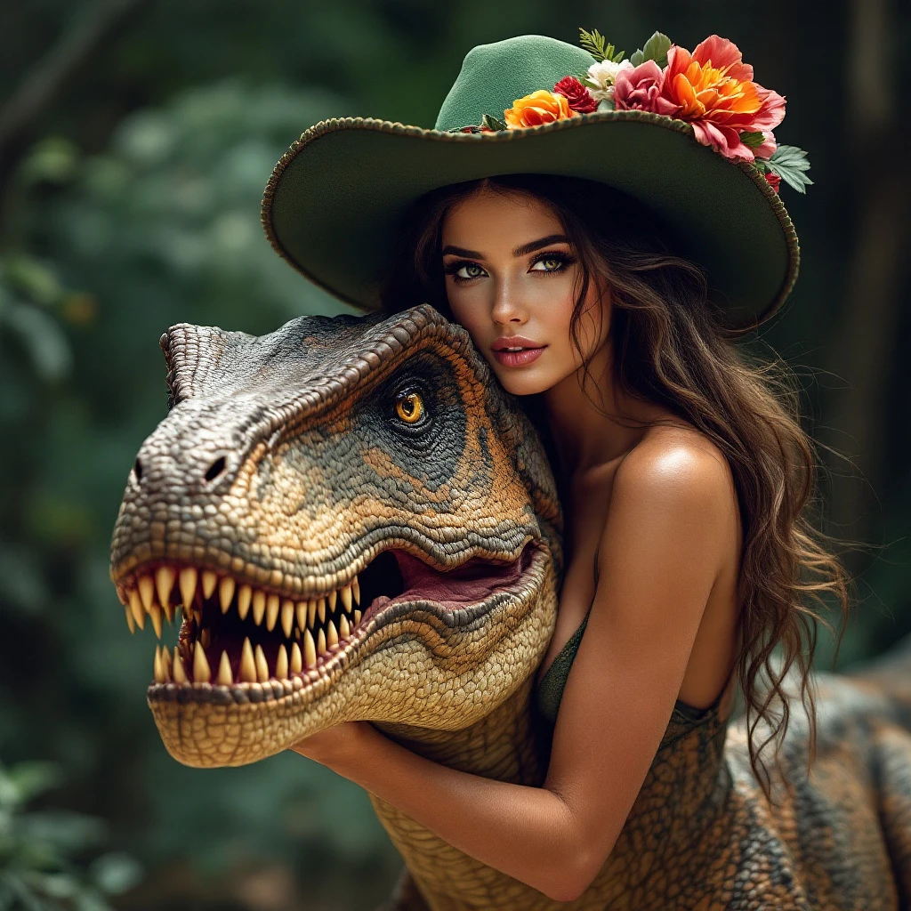 Una hermosa mujer, con un sombrero verde de vaquera elegante decorado con flores exuberantes y de cabello ondulado long hair, está cabalgando un dinosaurio T-REX grande