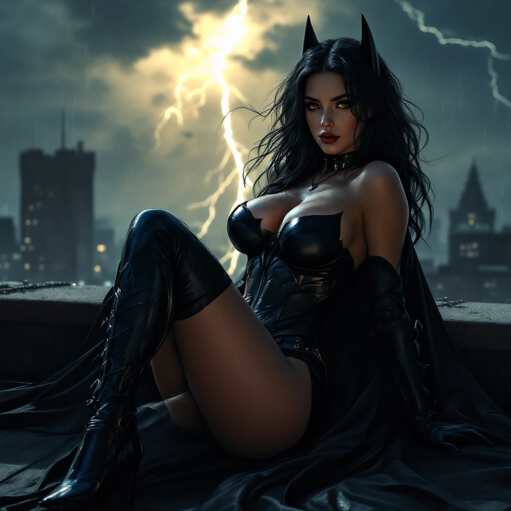 a female batman, she has deep cleavage, Resting on a rooftop in superhero pose, she has curves, small breasts, a cup, botlogo in the sky by the light, thunder behind her, black hair, brown eyes, full body shot, 4k, hyperrealistic, x plasque on her nipple