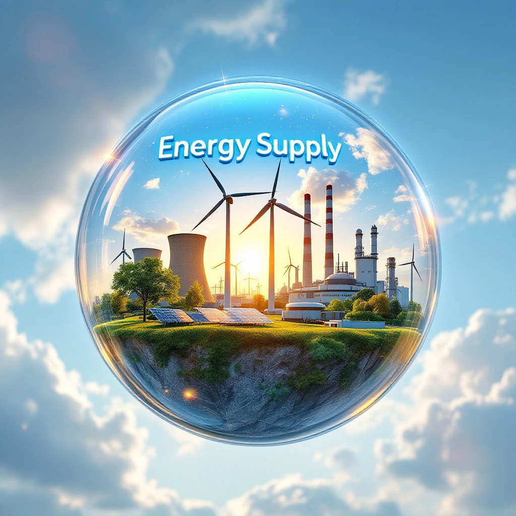 A photorealistic glass sphere floating in front of a serene blue sky with soft, white clouds. Inside the sphere, a dynamic energy landscape unfolds: Modern wind turbines and solar panels seamlessly blend with sleek nuclear power plants and state-of-the-art gas facilities. The renewable installations catch golden sunlight, while the conventional plants emit clean, minimal emissions. A holographic 'CDU/CSU - Energy Supply' text hovers above the sphere in crisp, blue letters. The scene symbolizes technology harmony, with power lines connecting all energy sources in a sophisticated grid pattern. The lighting is bright and optimistic, with lens flares highlighting key elements. Sharp details, high contrast, 8K resolution, hyperrealistic texturing on the glass sphere creating subtle reflections and refractions.