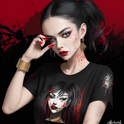 generate an image Dressed in a black shirt embellished with a bold red paint splatter pattern, she exudes an artistic and vibrant vibe. A gold cuff bracelet elegantly adorns her wrist, harmonizing with her ensemble. The ambiance surrounding her is a seamless fusion of casual elegance and a contemporary artistic touch, reflecting her confident and modern persona. This image encapsulates the captivating blend of sophistication and creativity, resonating with the spirit of a modern young woman in her twenties, enriched by an unmistakable Indian accent.