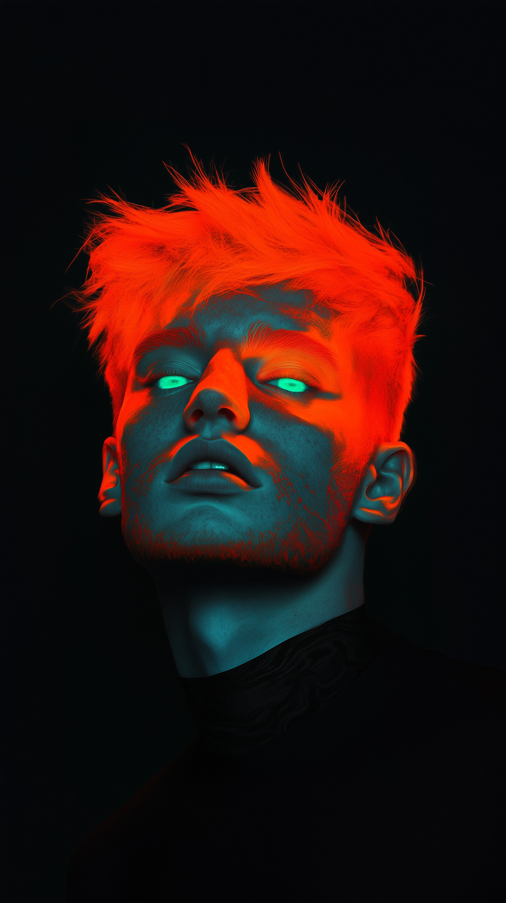 digital portrait, man with neon orange hair, using a futuristic and graphic design style, portrait feature sharp, angular facial features and bright teal eyes that contrast dramatically with black background, highlighting the vibrant, eye catching colors in a contemporary aesthetic --ar 9:16 --style raw --v 6. 1