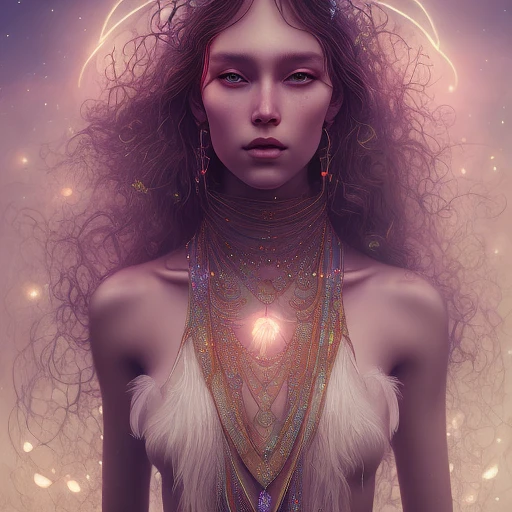 dancer with feathers and jewelry at night on the beach by the fire in the style of magali villeneuve, eve ventrue, anna dittmann, realistic depiction of light, luminous pointillism, daz3d, the stars art group (xing xing) , sultan mohammed, burned/charred