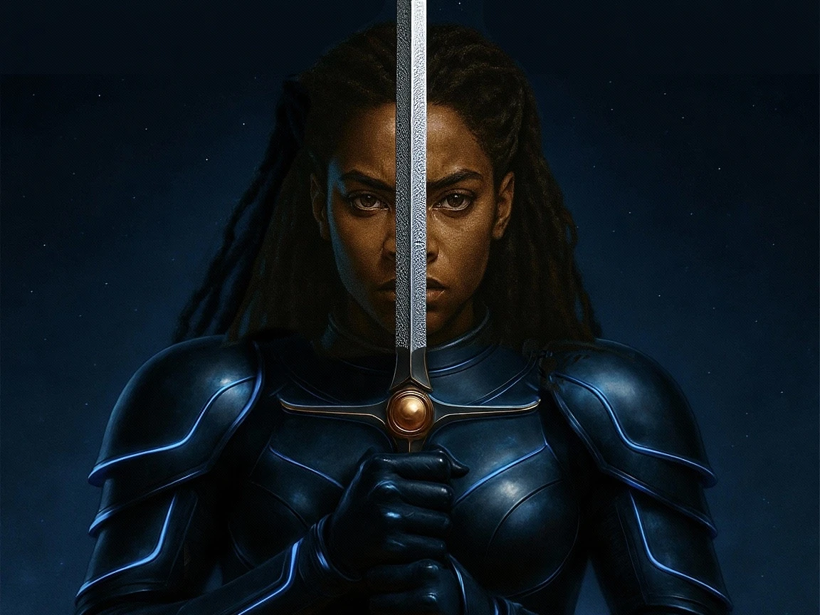 Redo this image in its same style but make the the blade of the sword look similar in texture as the bottom of the sword. Keep her face as natural as possible. Keep the natural photo face texture of the original picture, but make it just a little soft in texture. No Make up. And keep the cinematic quality and lighting of the picture. Do not change the dark brown complexion of the girl. Keep the armor uniform exactly the same.
