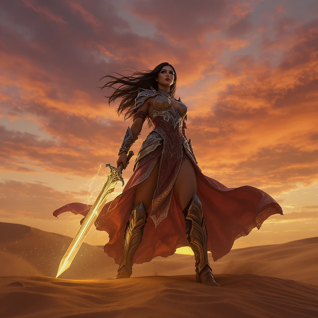 A powerful female warrior standing in a vast desert at sunset, viewed from a low-angle perspective to emphasize her imposing presence. She wears an elaborate armored dress with intricate patterns, flowing coat, and high boots. In her hand, she holds a glowing, ornate sword — not oversized, but radiant with symbolic power. Her long dark hair flows in the wind, with dramatic lighting casting warm orange and pink hues across the sand dunes. Epic fantasy, ultra-detailed, cinematic composition, dynamic heroic pose, realistic textures, soft glowing light, high resolution.