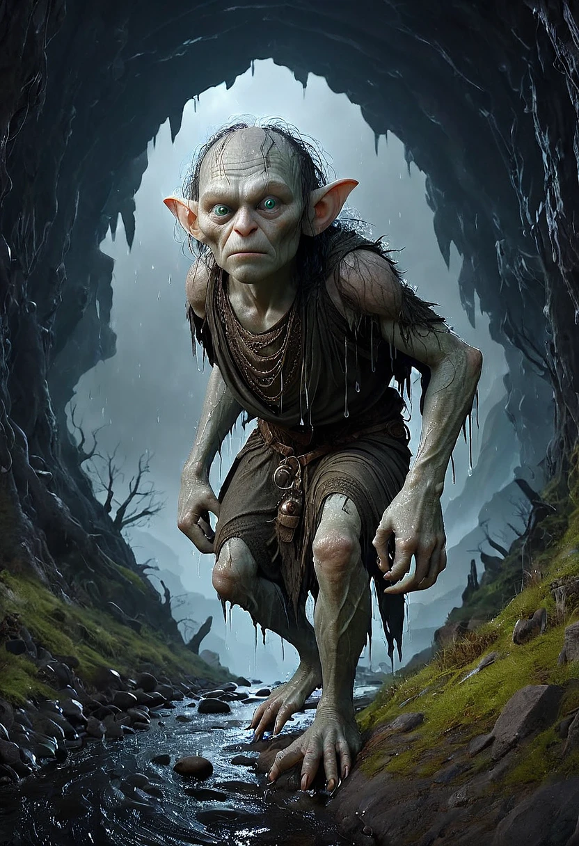 glamour shot of Gollum, Lord of rings, John Tolkien, morbide, dark, very detailed, rendered in octane, wet, dense atmospheric, epic, dramatic, empty, creepy, trail cam footage, photorealistic, hyperornate details, <lora:Fantasy_Monsters_XL,:1>