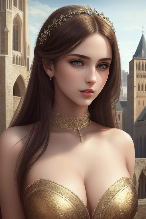 Beautiful young girl. Slender body. Fantastic face. Fantastic eyes. Against the backdrop of a medieval city. Beautiful face. Realistic face. Detailed face. Beautiful eyes. Detailed eyes. Realistic. High quality picture. Detailed picture. Masterpiece. ArtStation. A high resolution.
