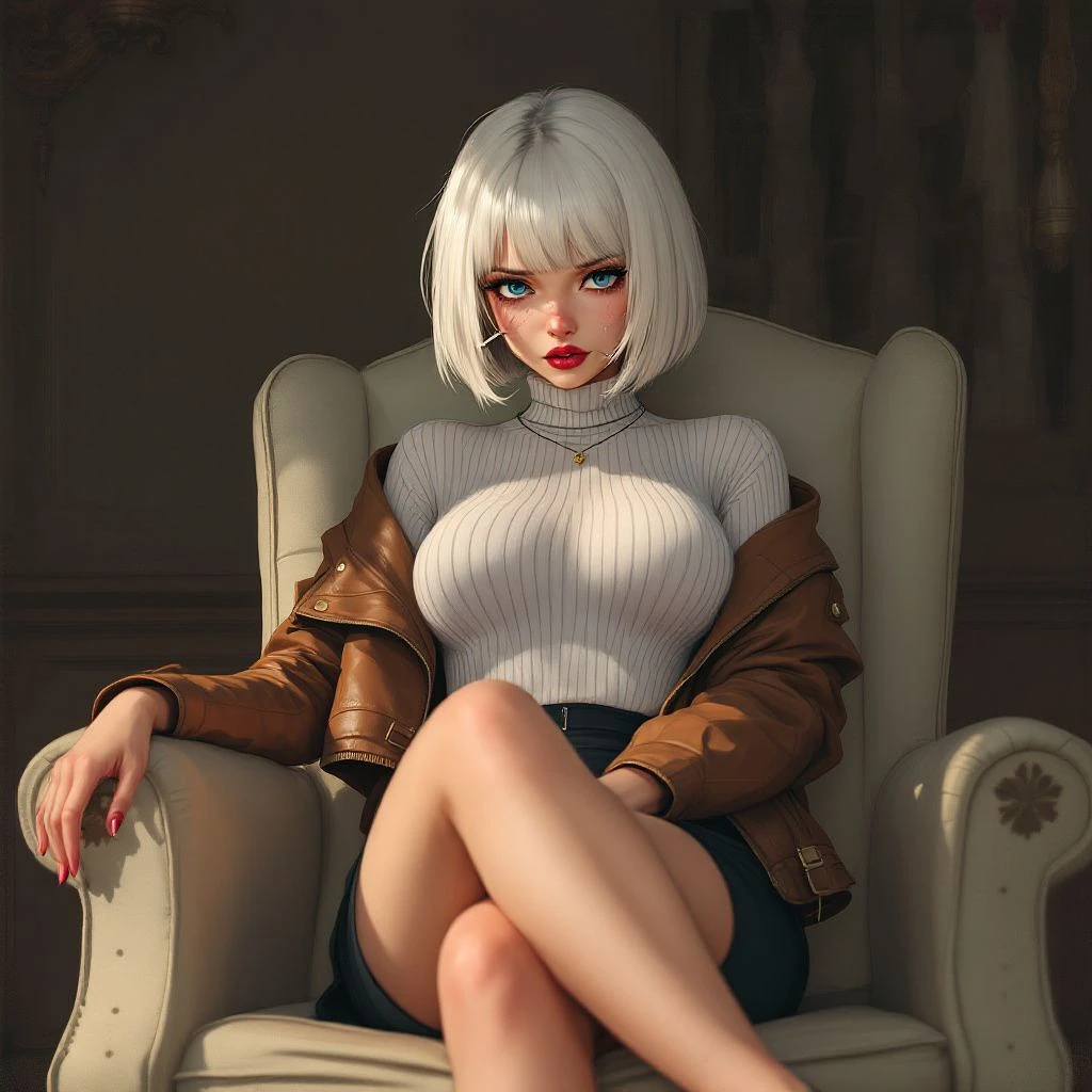 anime, woman, white hair, bob cut, blue eyes, freckles, red lips, white sweater, tight sweater, turtle neck sweater, short leather jacket, brown leather jacket, black tight skirt, black high heels, bored expression, sitting on a chair, sitting with legs crossed, bare legs, big chest, smoking a cigarette