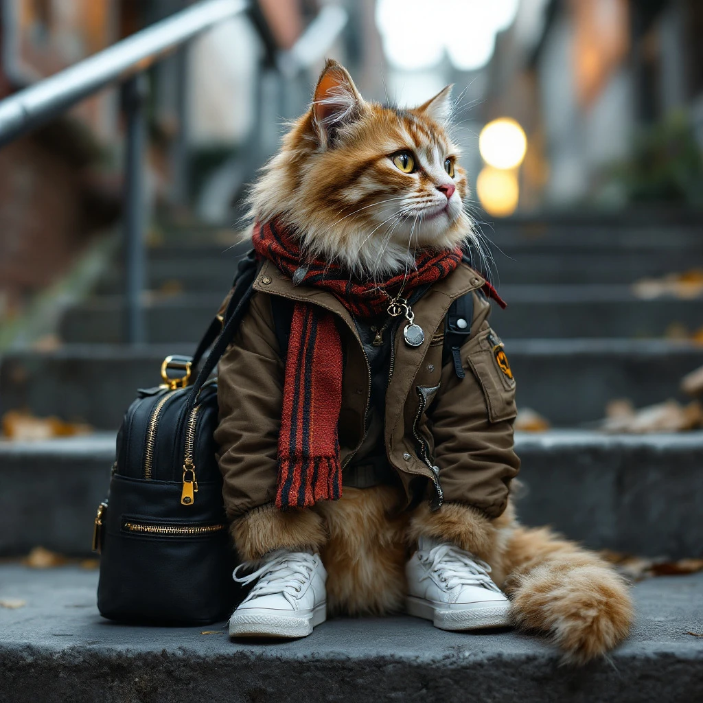 anthropomorphic, a cat named ”street style KOL kitty” wearing dark brown flight jacket, and white sneakers, with COACH bag, against an urban street background with wide depth of field, sitting on the stairs, adorned with mori style stripes, portraying a street life scene with a hip-hop flair, master shot, 4K