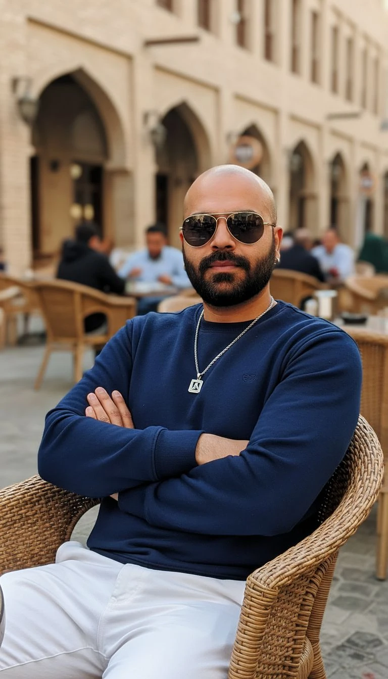 Create a hyper-realistic portrait of a stylish young man with a lean, toned physique (around 57 kg, 5'6 tall) — his beard remains unchanged, and his head is clean-shaven, giving him a modern, confident bald look. He wears one small, silver hoop earring in each ear, adding a subtle yet refined touch of individuality and style. (use my real face from the attached photo) . I am sitting casually at an outdoor café with a relaxed DOHA QATAR souq waqif, confident expression, leaning slightly back on the chair with my arms crossed. I’m wearing a navy blue sweatshirt with a small embroidered logo on the chest, white pants, I have AVIATORS sunglasses and a SILVER pendant necklace. The background shows a cozy AREBIAN-style café setting with wicker chairs, people sitting at tables, and brick building walls with large windows. The lighting is natural daylight with a warm, soft tone. Make the photo look like a professional lifestyle street photograph with realistic textures, depth of field, and cinematic color grading.