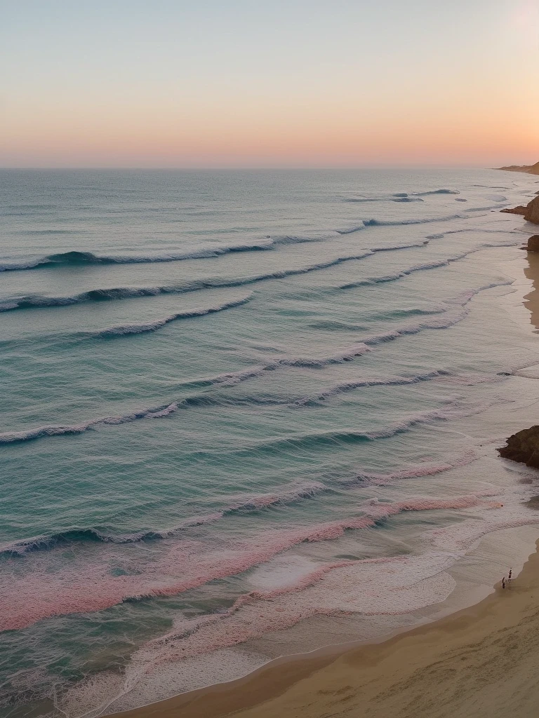 Uma vista serena da praia ao pôr do sol, ondas calmas tocando a areia, céu tingido de tons rosa, roxos e laranjas, silhuetas de pessoas caminhando na praia, evocando paz e contemplação, Pintura, tinta acrílica em tela, --ar 16:9 --v 5