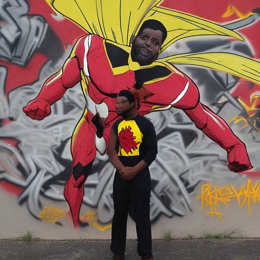 a blackman in a red and yellow superhero suit fighting a white man in a dog superhero suit, in front of a graffiti wall