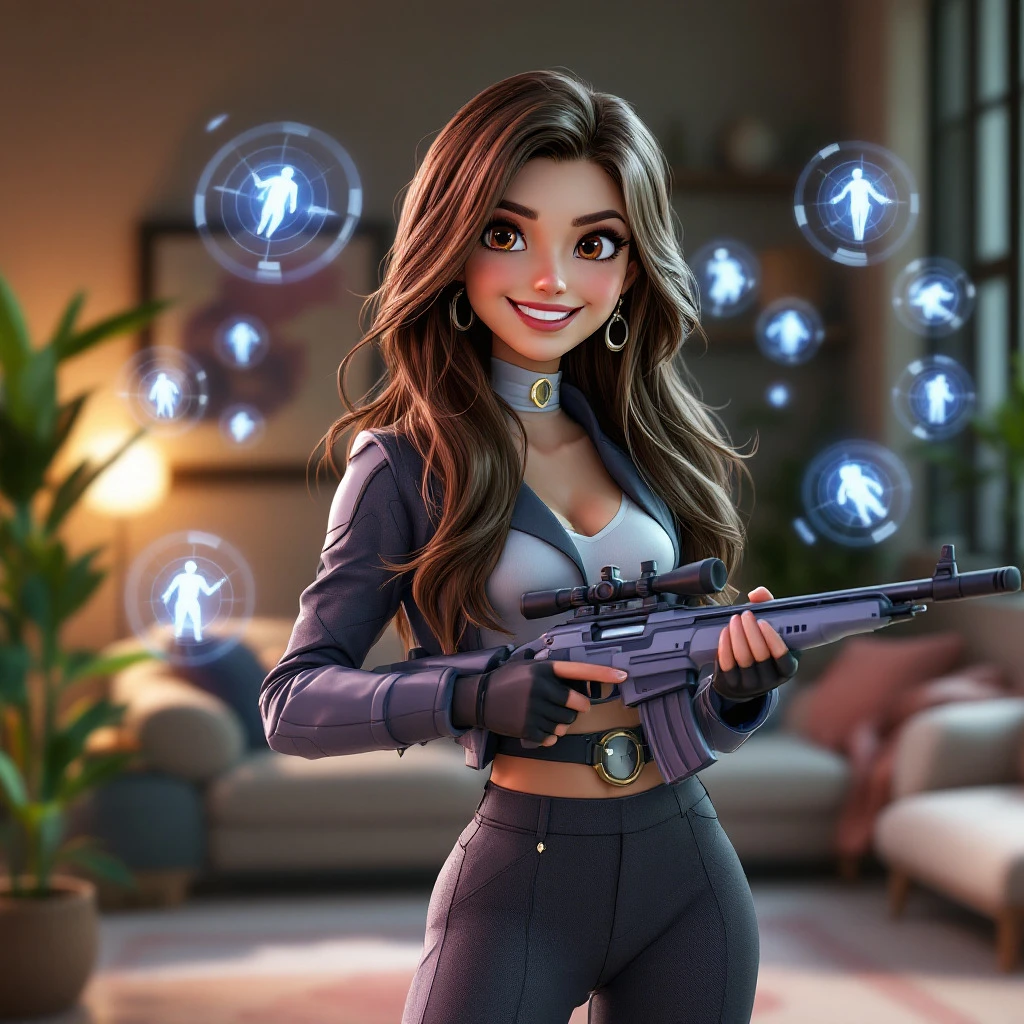 A digital artwork from Pixar Disney 3D of Caitlyn from League of Legends in a charming, youthful style. She has long, flowing brown hair and large, expressive eyes with a confident, joyful smile. Caitlyn is wearing a stylish, futuristic version of her signature outfit with a modern twist, including a sleek, tailored jacket and high-waisted pants. She holds her sniper rifle in a whimsical, non-threatening way, with transparent holograms of her targets floating around her in the room. The setting is a cozy, modern living room with soft dynamic lighting, engaging composition, and rich colors. The scene features oversized facial features and soft shadows, with a playful and animated Pixar-style atmosphere, full of life and warmth