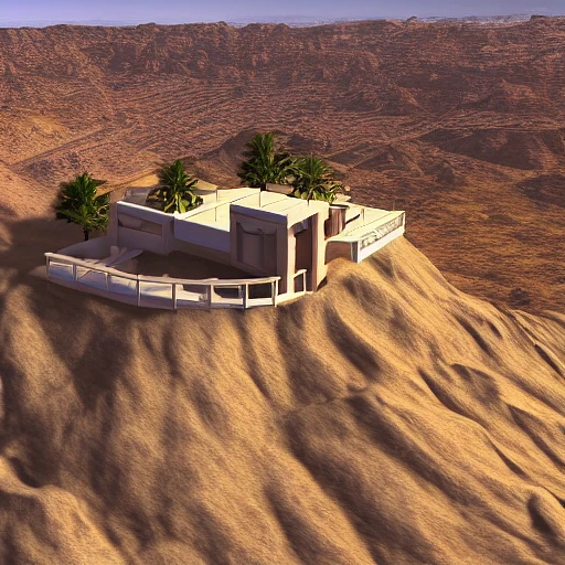 < Realistic architectural rendering, high on a cliff in the desert of the American Southwest, stylish, generative design, warm color tones, realistic, cinematic, unreal engine, 8K, HD, volume sunset --ar 9:54