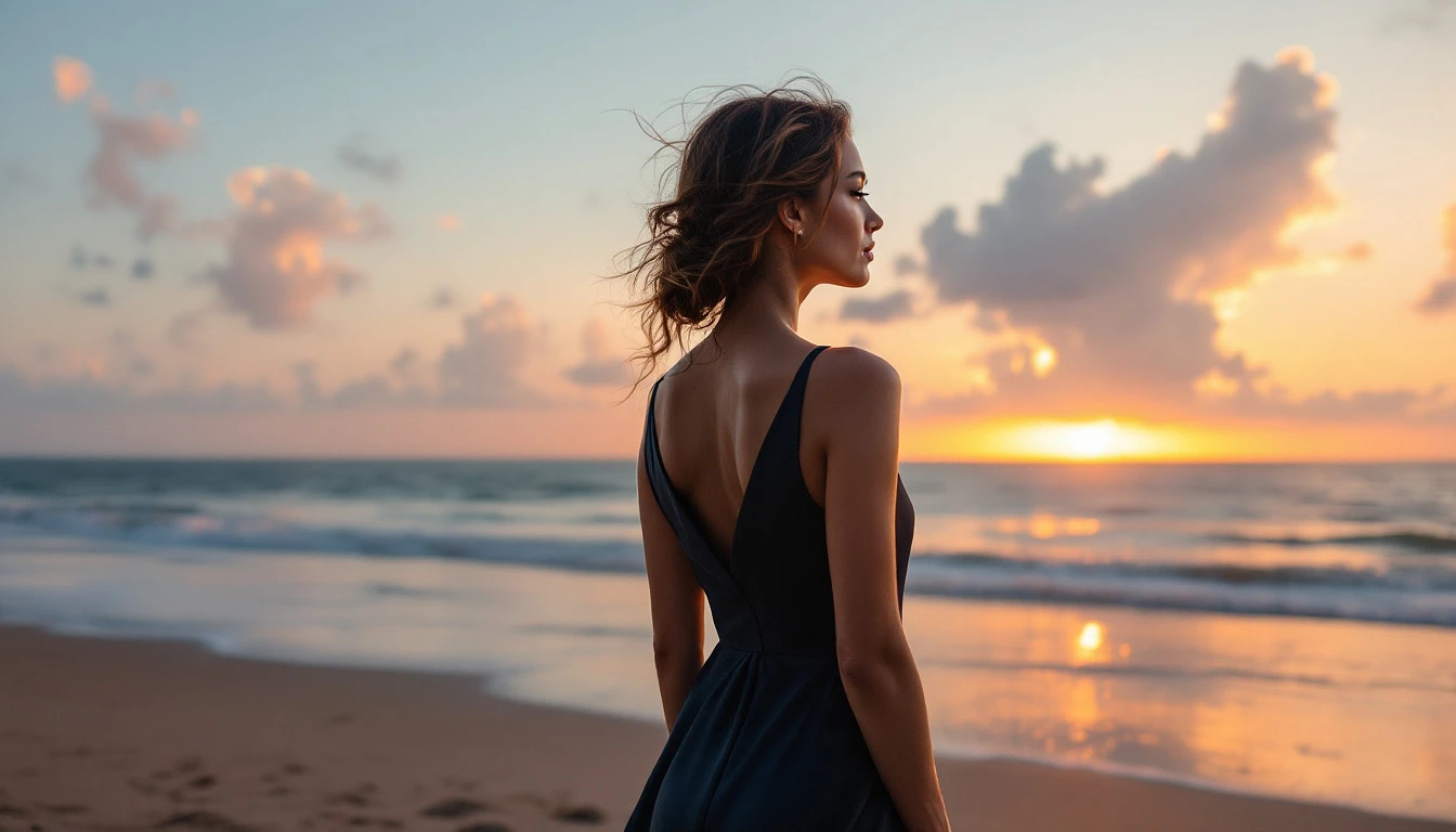 Estilo tipo inspirador. Paisaje: playa al atardecer. Una mujer con ropa de empresaria (sin aretes, ni accesorios en las orejas) que lleva un vestido cerrado, de vestir y elegante con su mirada al horizonte, vista a la distancia con su cuerpo en perfil, podemos ver el perfil de su rostro a la camara, distant view, mira hacia el cielo, el sol ilumina su rostros. Es importante que aparezca solo la silueta, distant view. No se le ve la cara.
