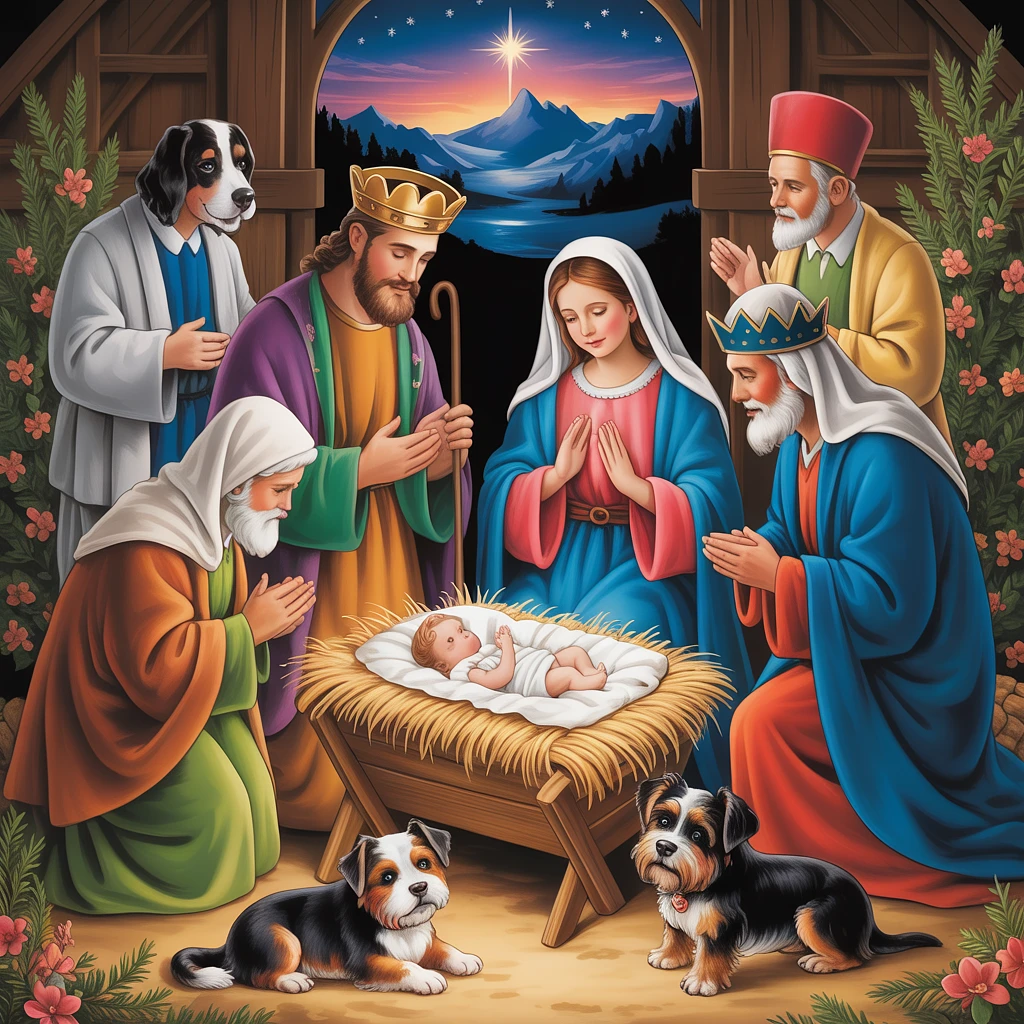 a traditional scene of baby Jesus in the manger, surrounded by Mary, Joseph, the three wise men. In the background of the picture there is a Bernese Mountain Dog and a Yorkshire Terrier.