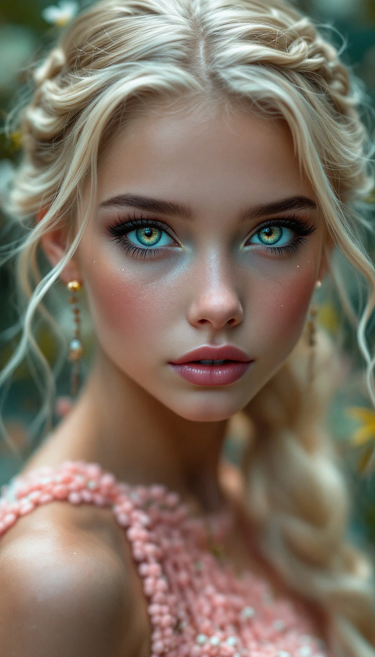 a professional photo of a exceptionally of the most beautiful mermaid (age 11) in the world (futuristic) , (masterpiece) , (realistic) , (perfect anatomy) , macro photography of a miniature little tinker-bell on top of a flower, flawless skin, visible fangs, large beautiful brilliant Forest Tea pink-red-golden eyes, black eye liner, light pink blush, dark black eye shadow, small dimples in chin very long blonde, white highlighted, one side braided hair, (8k) , (high res) , ultra-detailed, photo-realistic, front view, highly detailed, volumetric, dramatic light Perfect graphics, ultra-detailed, photo-realistic, full image view, full body view, front view
