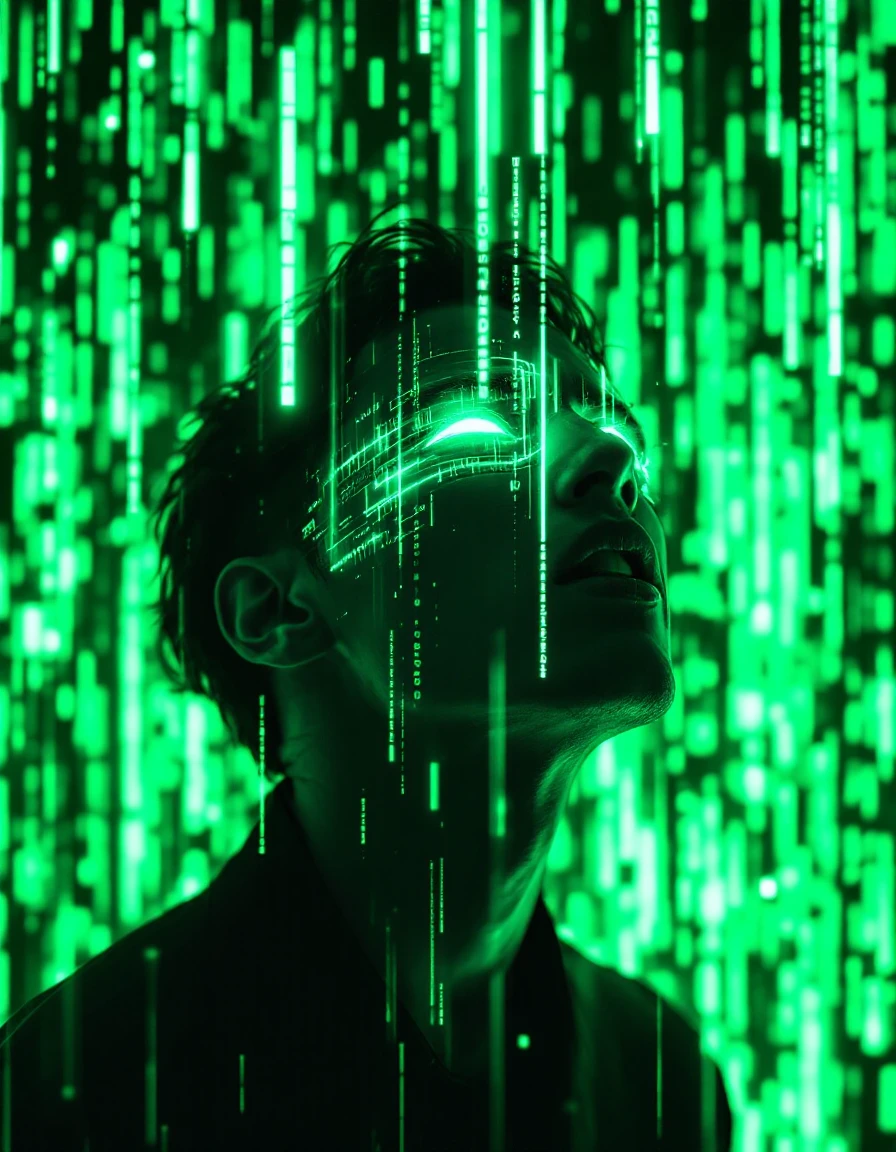 The background is a mesmerizing, glowing matrix grid in a vibrant light green hue, with cascading streams of digital code flowing vertically and horizontally, creating a futuristic and cyberpunk atmosphere. At the center of the image is A close-up of a face (partially obscured and distorted by digital interference) expressing a mixture of pain and ecstasy. The eyes glow neon. The lighting is dramatic, with soft neon green highlights illuminating his silhouette, casting subtle shadows on the matrix background. The overall vibe is sleek, high-tech, and enigmatic, evoking a sense of power and sophistication. Futuristic, abstract, electro-industrial aesthetic. 16:9 aspect ratio