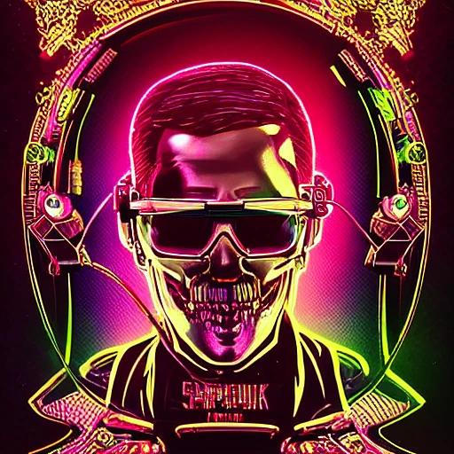 nft style, cyberpunk, synthwave, tarot card with intricate detailed frame around the outside | with cyberglasses neon, and earphone, dj sound, futuristic, gold, diamond, side profile of cyberpunk body with cyborg skull | cyberpunk | styled in Art Nouveau | insanely detailed | embellishments | high definition | concept art | digital art | vibrant, hyperdetailed, intricate, kaleidoscope, extremely beautiful, ranking ligth, cinematic lighting, photo realistic, white background max detail, ranking ligth, cinematic lighting, photo realistic, by mandy jurgens, moebus, jon foster, alphonse mucha, glazing, pablo picasso, pinot noir, chiaroscuro, leonardo da vinci, Michelangelo, 8k