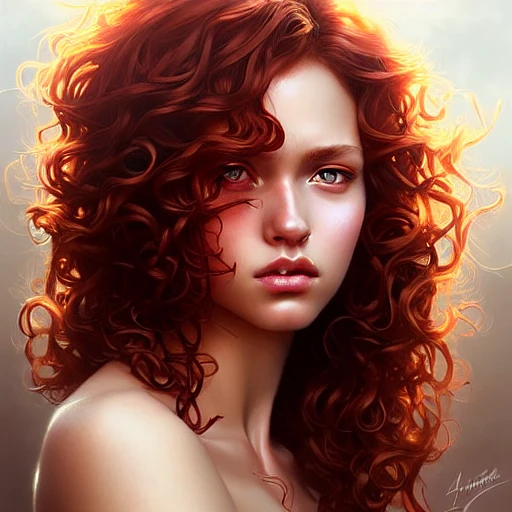 beautiful young female, enchanting focused hazel color eyes beautiful face, insanely detailed red long curly hair, olive skin, luscious lips, closeup, soft illumination, by artgerm and greg rutkowski