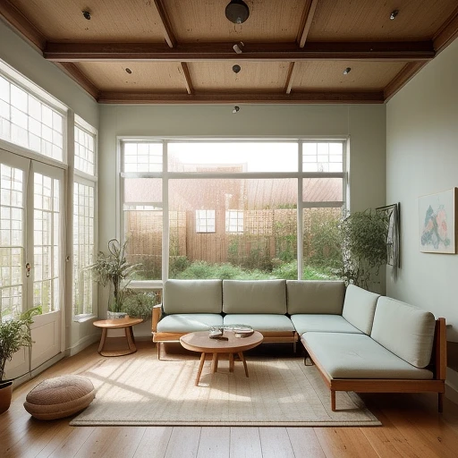 High resolution photography interior design, dreamy sunken living room conversation pit, wooden floor, small windows opening onto the garden, bauhaus furniture and decoration, high ceiling, beige blue salmon pastel palette, interior design magazine, cozy atmosphere; 8k, intricate detail, photorealistic, realistic light, wide angle, kinkfolk photography, A+D architecture
