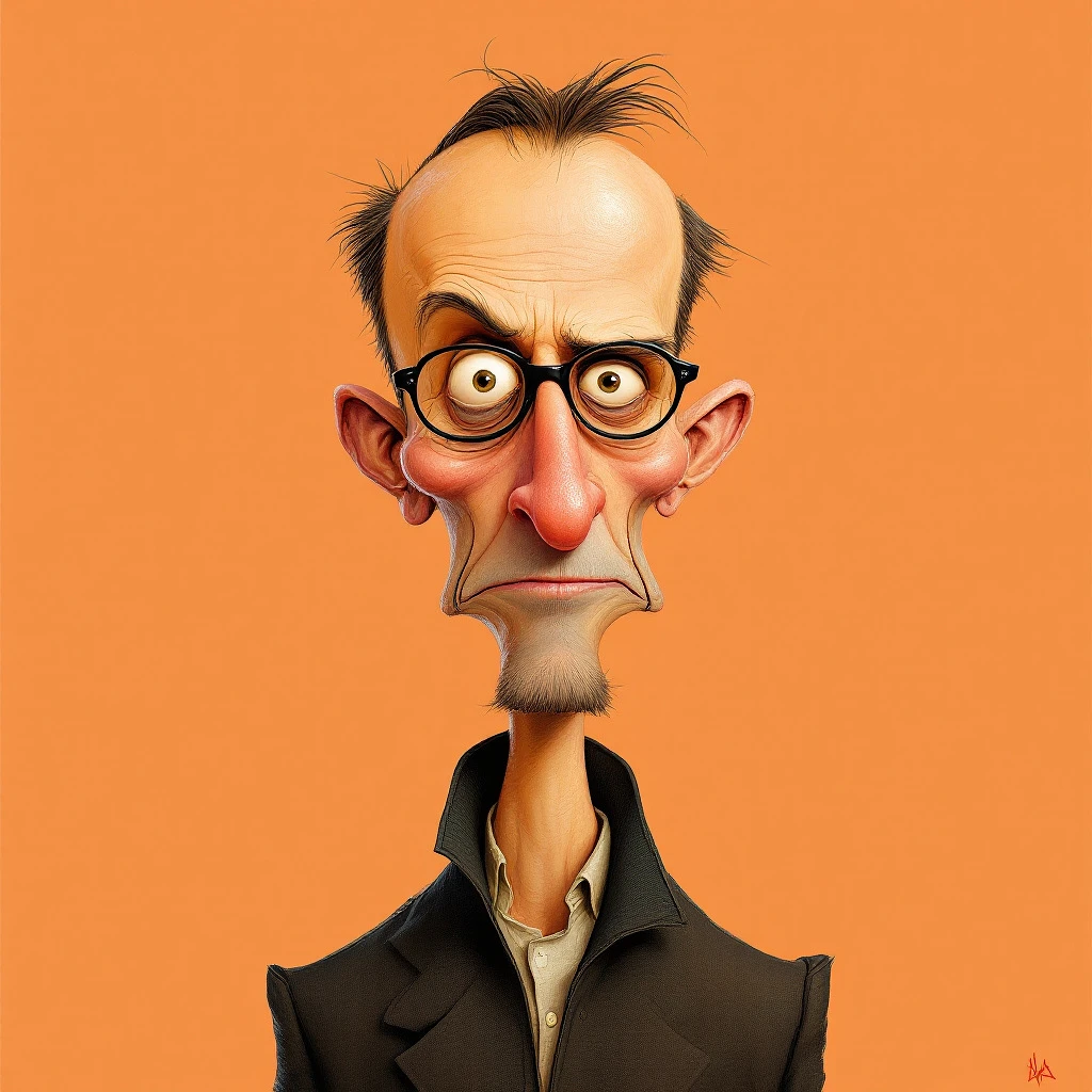 A caricature of a man with exaggerated features is set against a vibrant orange backdrop. The overall style is humorous and slightly grotesque