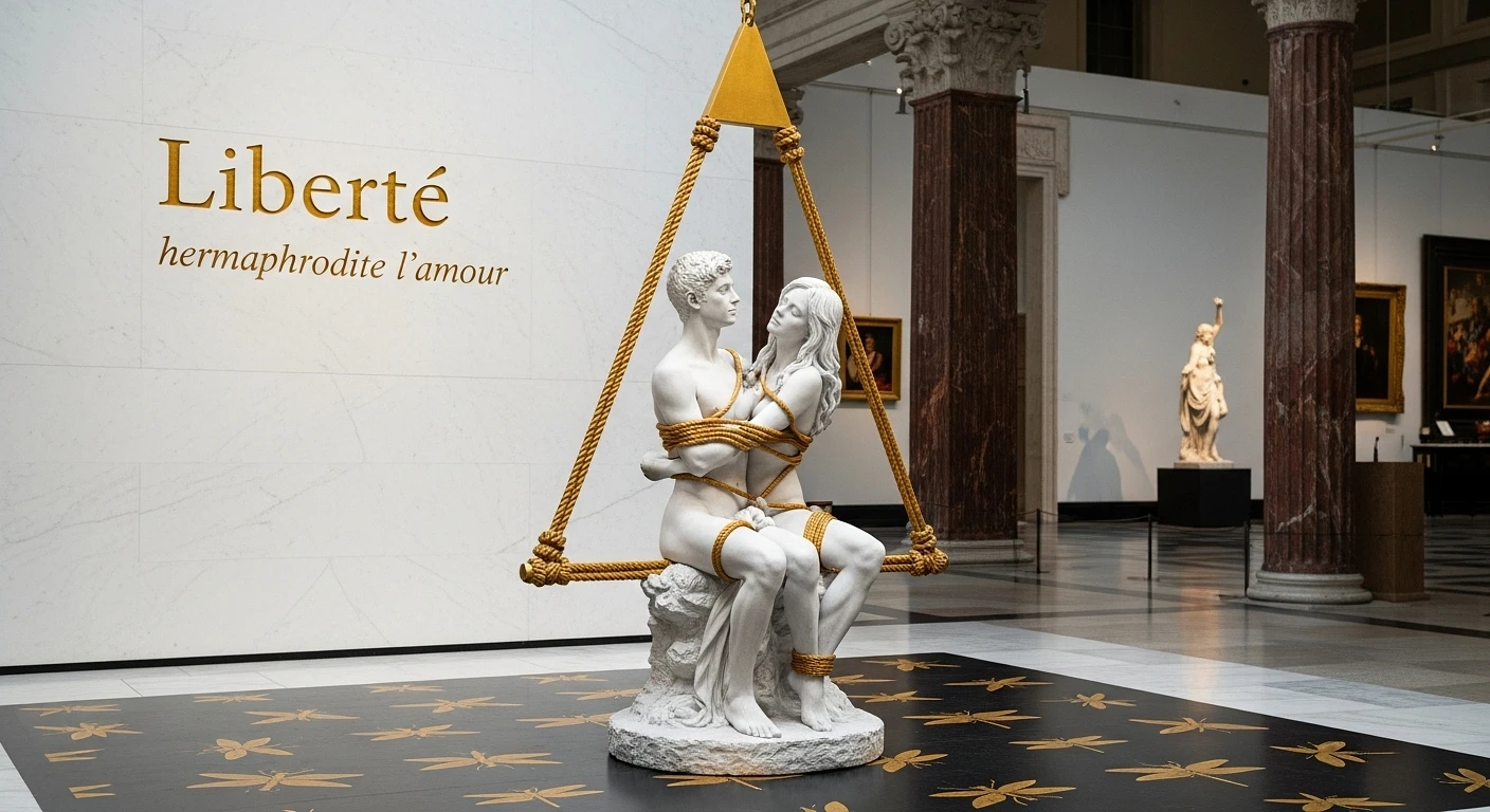 Photo. in a art Musea. a wall of white marmer with the text in gold "Liberté" and "hermaphrodite l'amour", in a Temple background and art Rubbens paintings, Musea of all time, a big marmer statues of one tied on a big golden hanging triangel up marmer hermaphrodite lover in real soft grey marmer, statues of a verry detailed woman looking transgender clearly visible young man verry detailed visible larger lovely tied visible private parts, with puffy soft breast and long hair and female face is fulgair loving, feeling and Humiliation with ropes vulgair playing with herself with her hands intence scantily dressed in marmer, scantily dressed, on the black marble floor, back pose, all in white marmer with a golden Dragonfly print repeat in the marmer floor, -- real prof photo