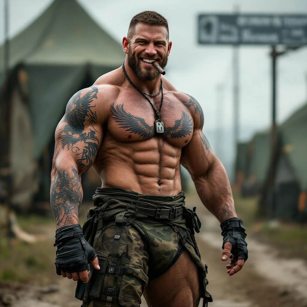 Chris Redfield, Full body image, looking at us, shirtless, muscular abs, lots of tattoos, eagle chest tattoo, dog tags, big cigar in mouth, black fingerless gloves, camouflage thong underwear with huge long bulge, big feet in black combat boots, standing on dirt road with army green tents, flexing one bicep, grinning