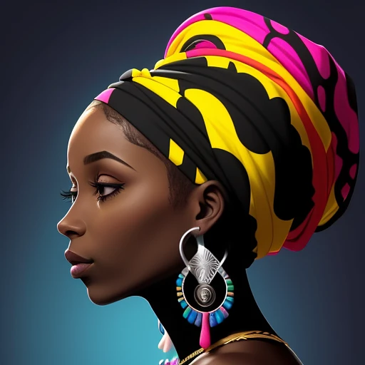 Black silhouette of african american woman in a colorful head wrap and with an earring. Beautiful black girl profile