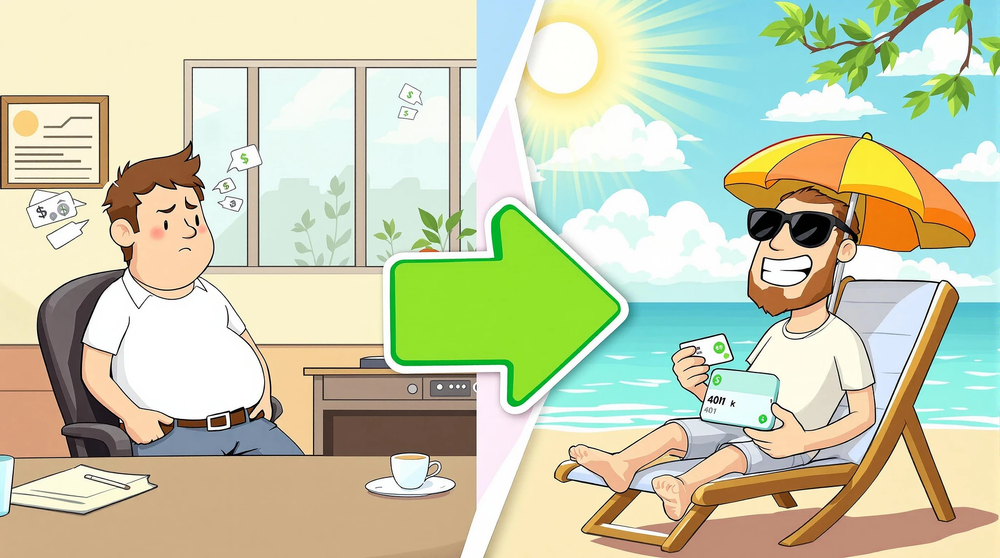 Split image in animated cartoon funny style: left side shows a stressed-out man with empty pockets sitting at a desk, right side shows a wealthy man in sunglasses relaxing on a beach chair with a money umbrella and “401 (k) ” card in hand — large green arrow pointing from left to right — sunny, vibrant colors — 16:9, clean and bold layout