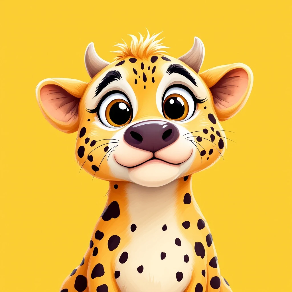 illustration, vector cartoon-style, cute cow's face, zoom in, expressive eyes and a playful demeanor, thick outlines, rounded features and a youthful appearance, solid vibrant yellow background, cheetah's fur should be rich golden with distinct black spots, slight smile and whiskers to enhance --ar 9:16 --style raw --stylize 500 --v 6