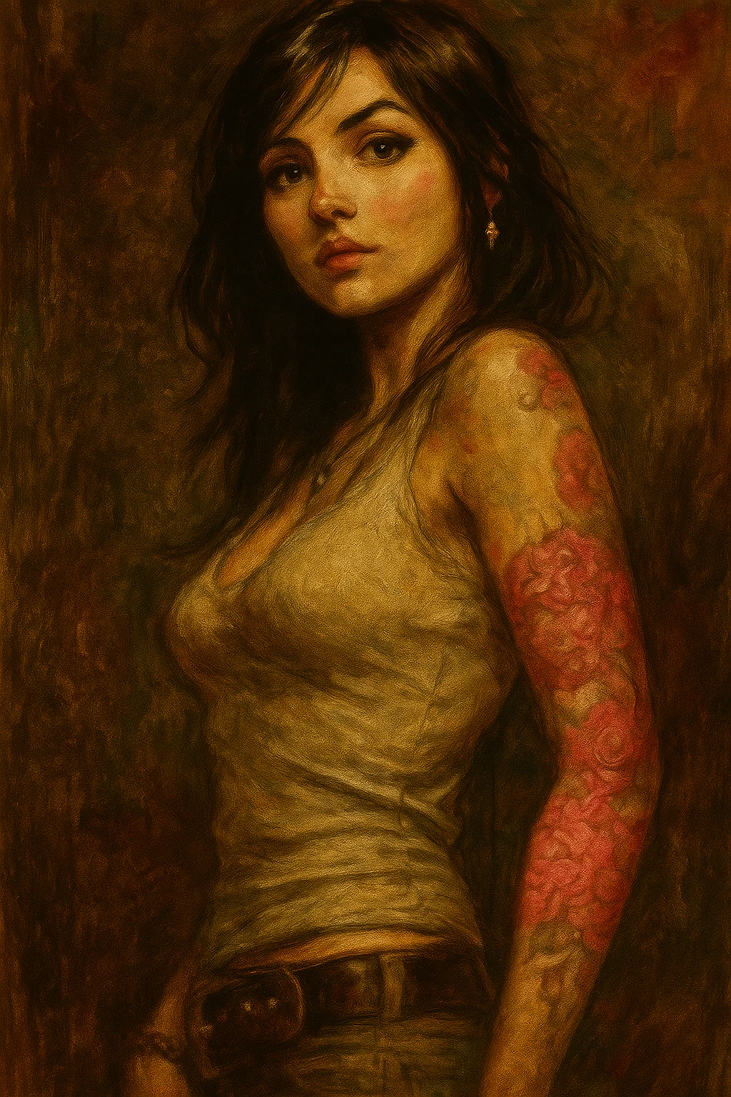 Coloriser cette image en utilisant le style de Frank Frazetta, le tatouage du modèle est dans les tons roses