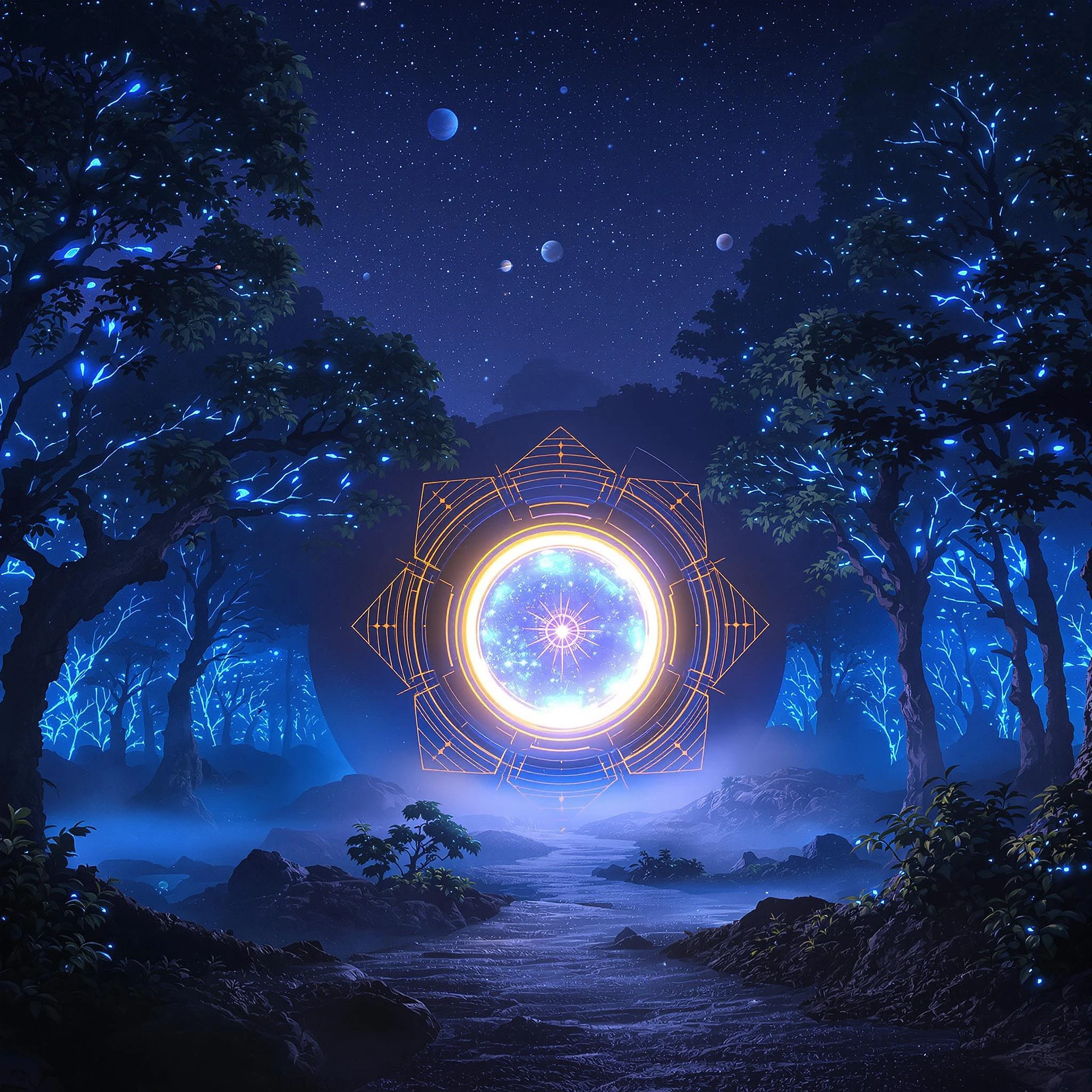 A glowing sci-fi portal in the centre of a misty enchanted forest, surrounded by bioluminescent trees with vibrant blue hues, under a starry night sky with visible small planets in the background. Highly realistic, with soft lighting and a mysterious atmosphere.