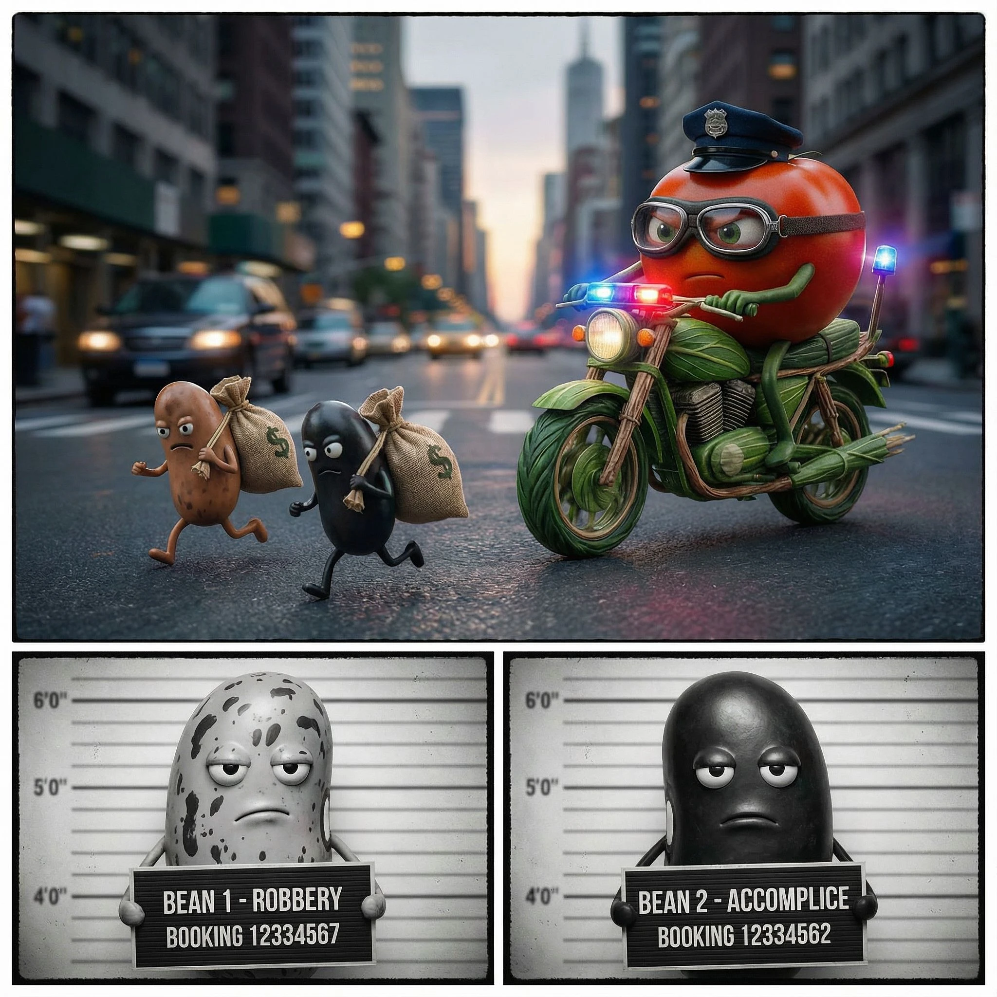 a hyper realsitic tomate chasing two hyper realisitc beans, who are criminals. looks like real life