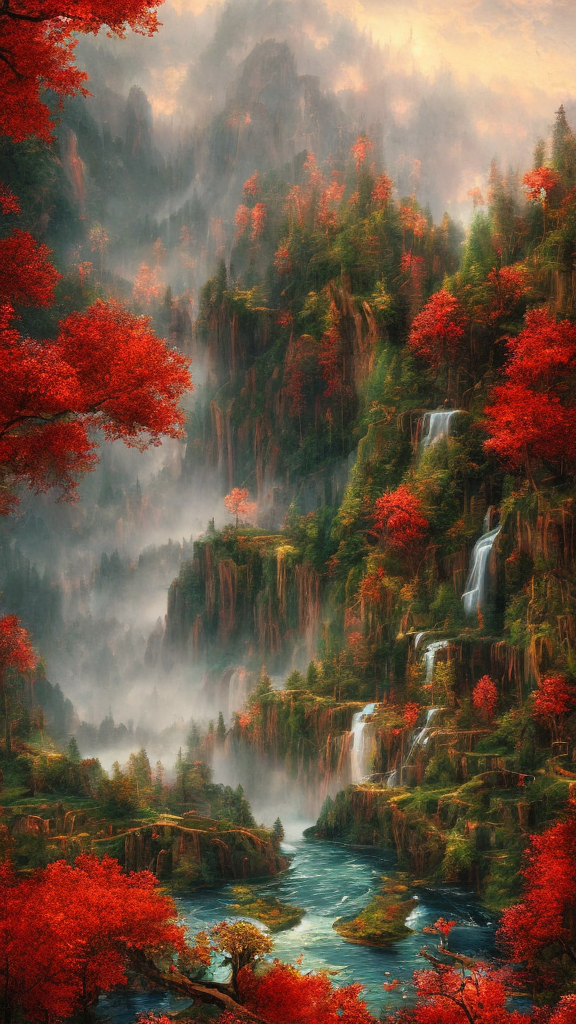 Openjourney prompt: summer landscape, red color, Bokeh, the waterfall,...