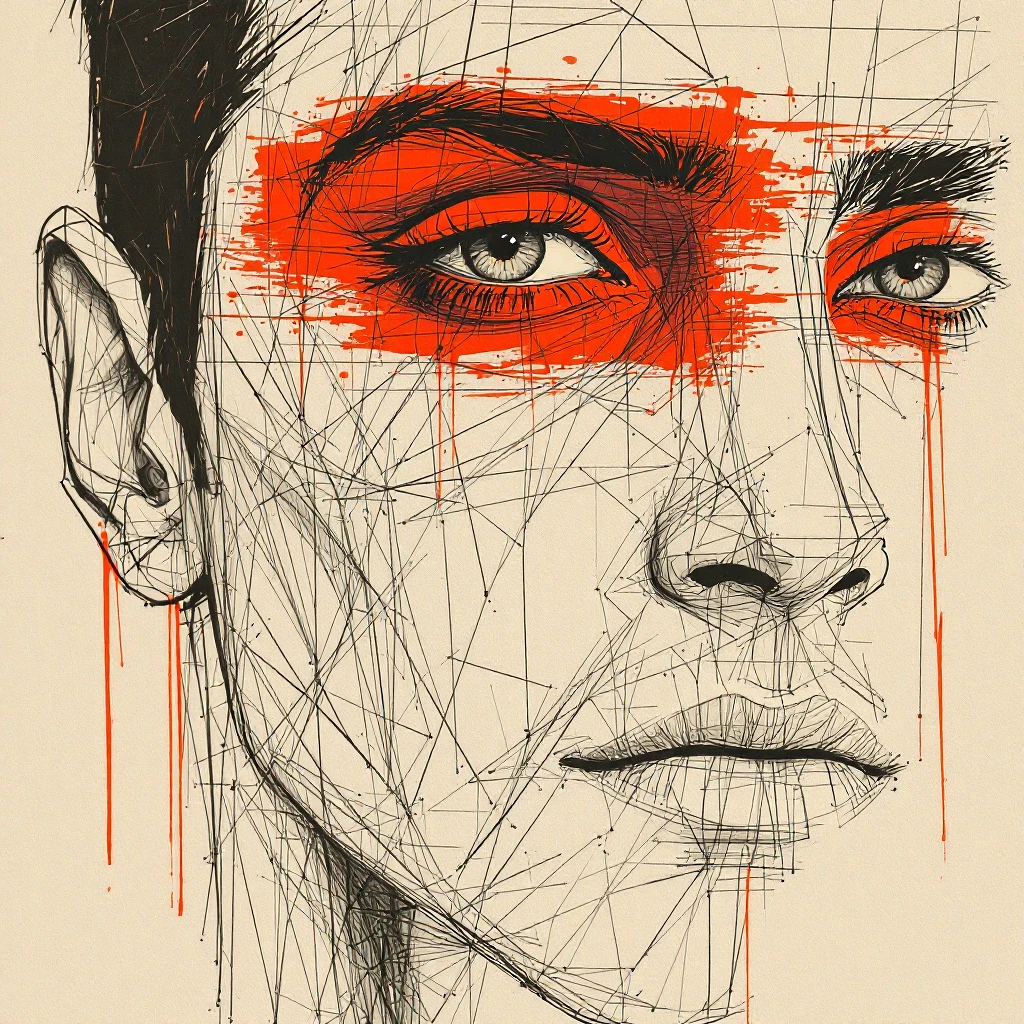 a drawing of a man's face with a red eyeshadow, in the style of bold colorful lines, dark beige and orange, made of wire, flawless line work, captivating portraits, raw and edgy --chaos 30 --ar 1:2 --personalize 2gwf1qc --stylize 750 --v 6. 1