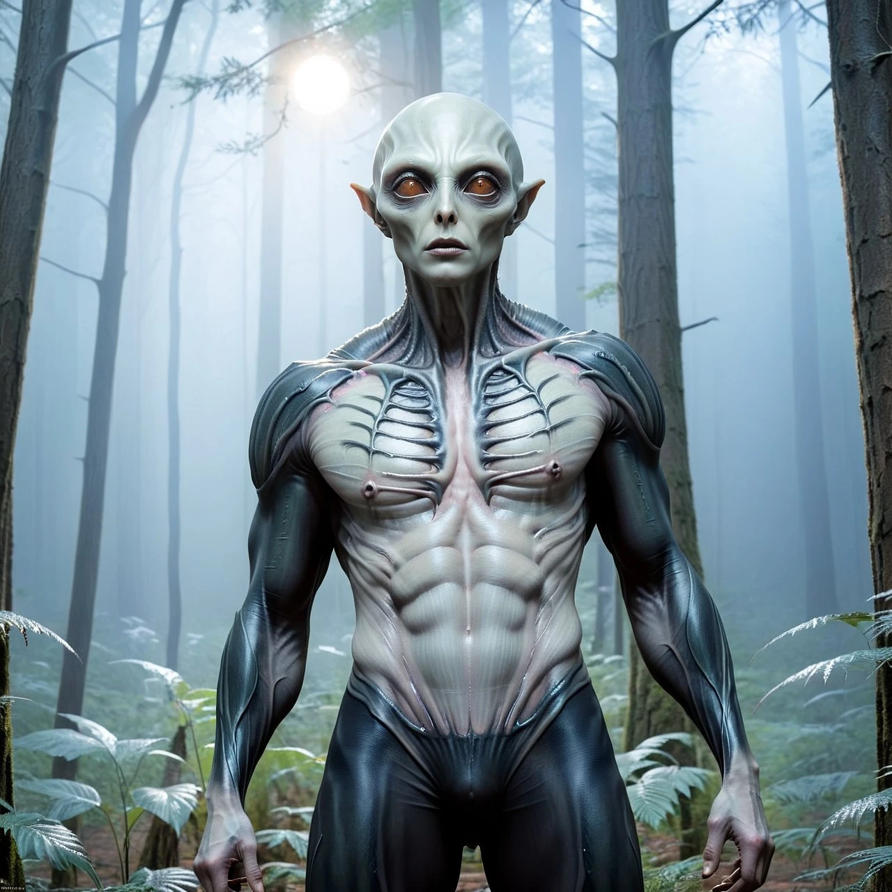 (delightful anatomy:1. 1) , (gloomy illumination, insane, stunning, dramatic, completed artwork, HQ:1. 1) , (Dan mumford style:1. 2) , Terrifying Roswell gray alien in the woods, soft pale skin, regular body muscle, wearing a black fabrics form-fitting outfit to the neck , creepy, dramatic lighting, photorealistic, cinematic, <lora:epiNoiseoffset_v2:1> , 16k, UHD, HDR10, 16K, ((Masterpiece) ) , Absurdres, (Masterpiece:1.3) , (best quality:1.3) , <lora:add_detail:0.4> <lora:epi_noiseoffset2:0.4> <lora:hairdetailer:0.6> <lora:more_details:0.3> <lora:add-detail-xl:1.2> <lora:DetailedEyes_V3:1.2> <lora:sd_xl_offset_example-lora_1.0:1.2> , (natural skin texture, hyperrealism, soft light, muted colors) , background