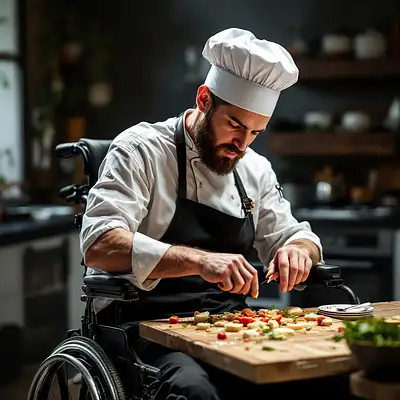 creative chef working on his wheelchair after spinal cord injury whith reduced hand mobility who has invented their own utensils