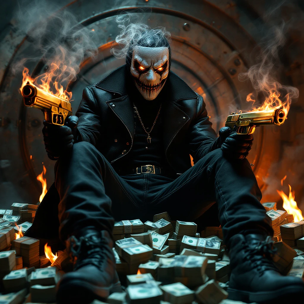 a crazy character wearing a sinister looking face mask where you can see facial features, black leather coat, black jeans and timberland boots, black gloves holding smoking gold guns with the smoke making $ signs made of smoke and is sitting on a pile of money, stacks of cash bundled with $10, 000 bands around them all on fire and behind him on an decayed abstract bank vault wall , cinematic, hyper realism, high detail, 3d illustration, 8k