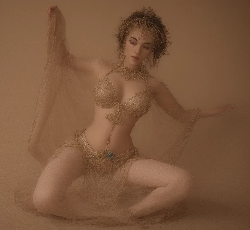 A breathtakingly detailed, hyper-realistic depiction of a gorgeous woman kneeling elegantly dressed in a stunning belly dancing outfit, adorned with intricate gold jewelry. Her stomach is taut and chiseled, poised confidently within an ornate desert sand dance pit located by a couple majestic pillars. Exquisite, photorealistic face with precise cosmetic features. Stunning, detailed eyes sparkling with vitality. Full, luscious lips and flawless, radiant skin. Hip-length, luscious dark raven hair cascades beautifully around her. Wearing a flowing red skirt and matching bra, with gold accents, embroidery, and green gemstones. Dramatic, cinematic lighting casts soft golden hues across her serene form. " cinematic, hyper realism, high detail, octane, 8k, hyper realistic, focused, extreme details, Action Pose, cinematic, masterpiece, detailed gorgeous face, beautiful girl, Big chest, cosmetic textures, Realistic face, Beautiful eyes, cosmetic features, highly Detailed face, Detailed eyes. Photorealistic, Attractive Model Masterpiece, Artstation. 8k sharp focus, photorealism,