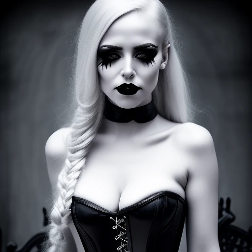 photo of a Gorgeous blonde goth girl wearing black leather corset, dark greyscale graveyard background, elegant, lace