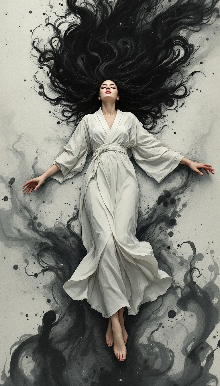 6. A whimsical, full-body scene of a woman swimming through a sea of ink, her body leaving trails of swirling, calligraphic forms. She wears a simple, white robe, and her hair is a cascade of inky darkness, as if she is both creating and being created by the liquid medium. The style blends the fluid grace of calligraphy with the dynamic energy of abstract painting and the surreal imagery of dreamscapes.