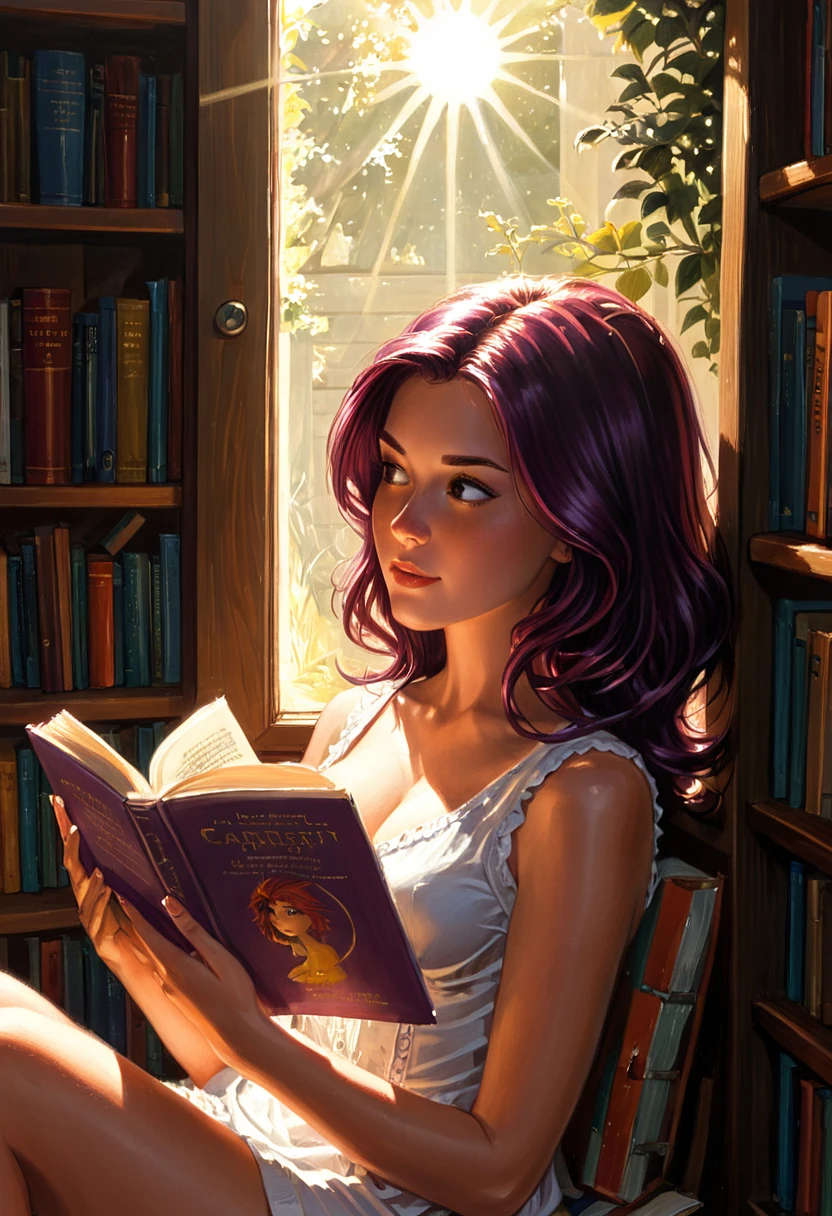 comic <lora:xl_more_art-full_v1,:1> , <lora:DreamARTSDXL,:1> , A realistic painting of a 22-year-old woman with deep plum-colored hair reading a book in a sun-dappled reading nook of her home library, the light casting soft shadows across her face and the open pages of the book. . graphic illustration, comic art, graphic novel art, vibrant, highly detailed