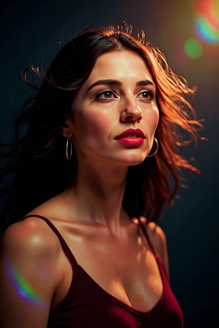 "Professional photography, fine art style, warm and slightly dark tones. Epic scene featuring a woman in a surrealist style. Bright, vibrant colours, soft lighting, lens glow effect, heroic scale, soft contrast"