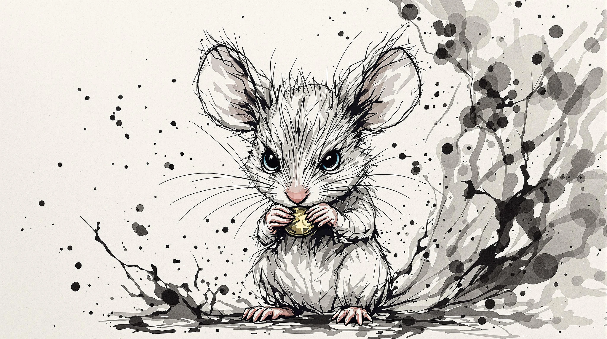 cute Mouse with straight face grabing something, detailed, ink style, Ink splash art on the background, ink style, Ink wraps around the body, and the ink obscures the subject, exquisite